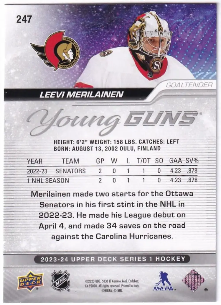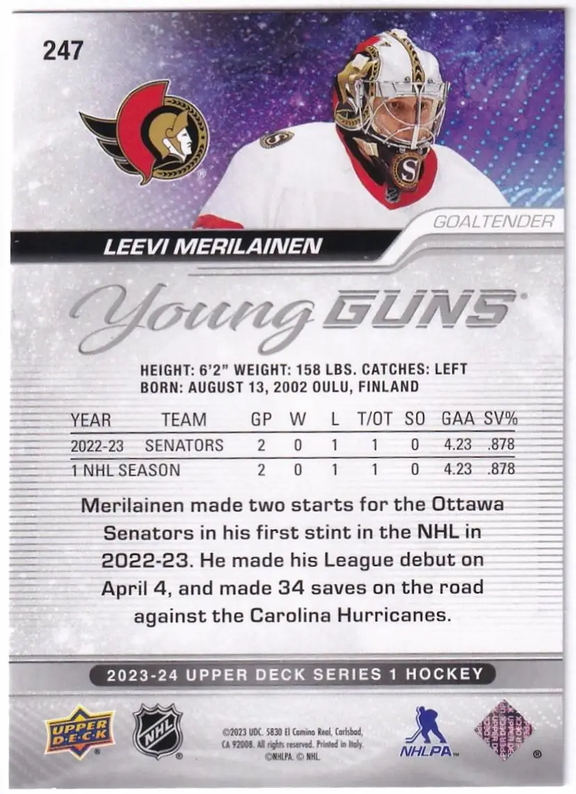 2023-24 Upper Deck #247 Leevi Merilainen YG RC Ottawa Senators