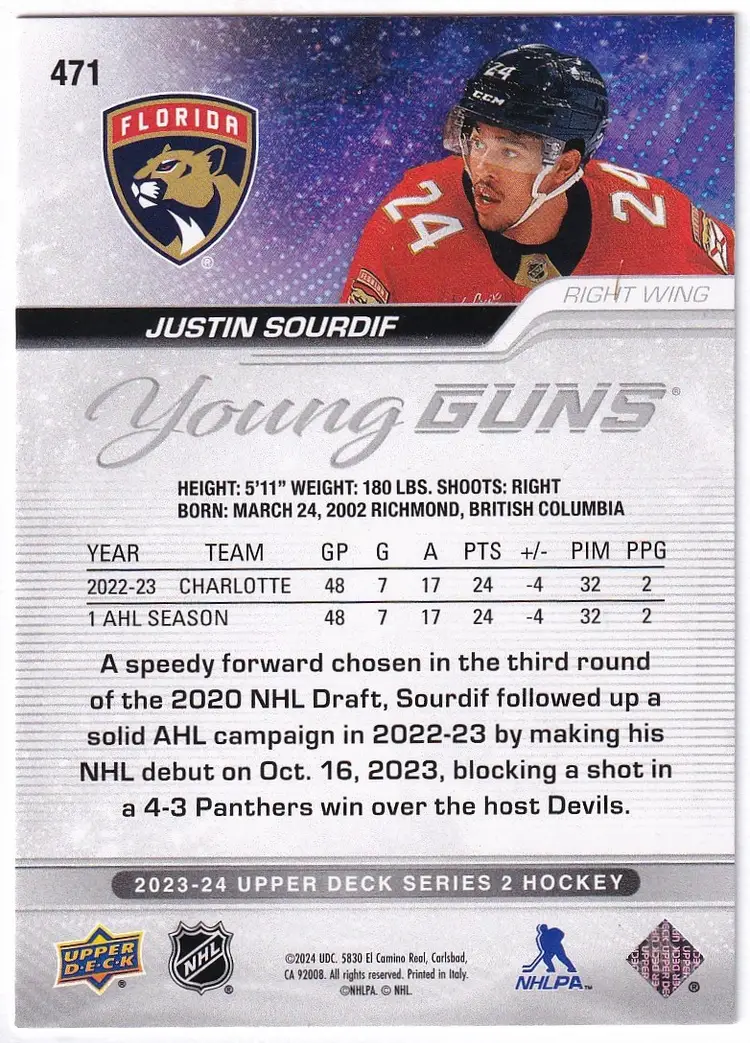 2023-24 Upper Deck #471 Justin Sourdif YG RC Florida Panthers Hockey Card
