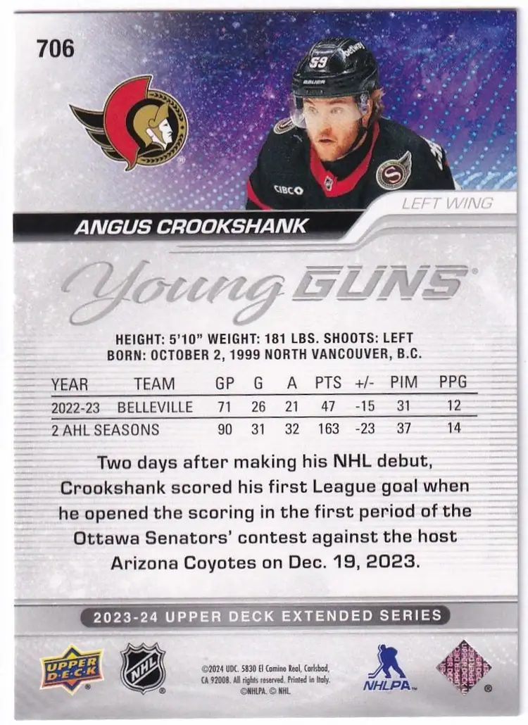 2023-24 Upper Deck #706 Angus Crookshank YG RC Ottawa Senators Young Guns