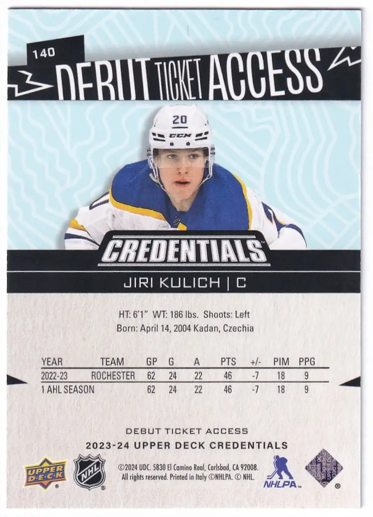 2023-24 Upper Deck Credentials #140 Jiri Kulich RC Buffalo Sabres Print Run - 999