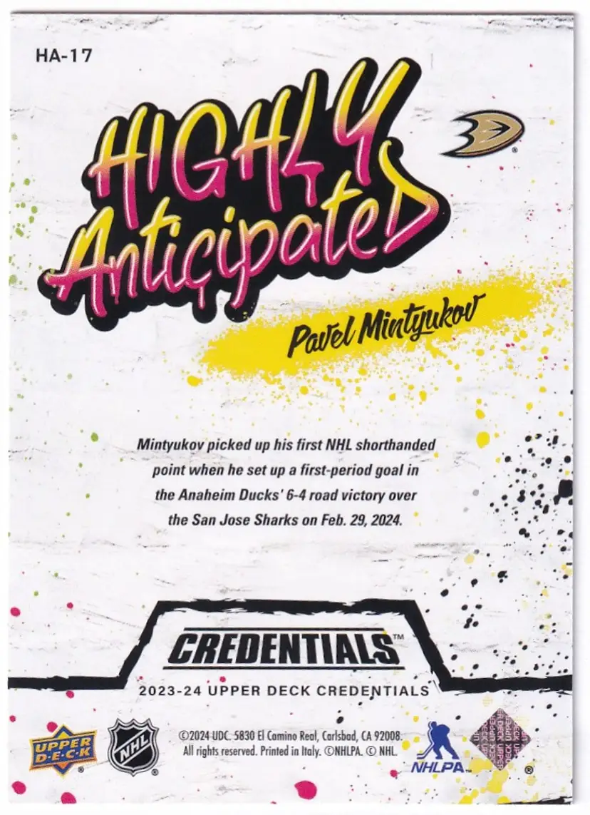 2023-24 Upper Deck Credentials Highly Anticipated #HA17 Pavel Mintyukov Anaheim Ducks