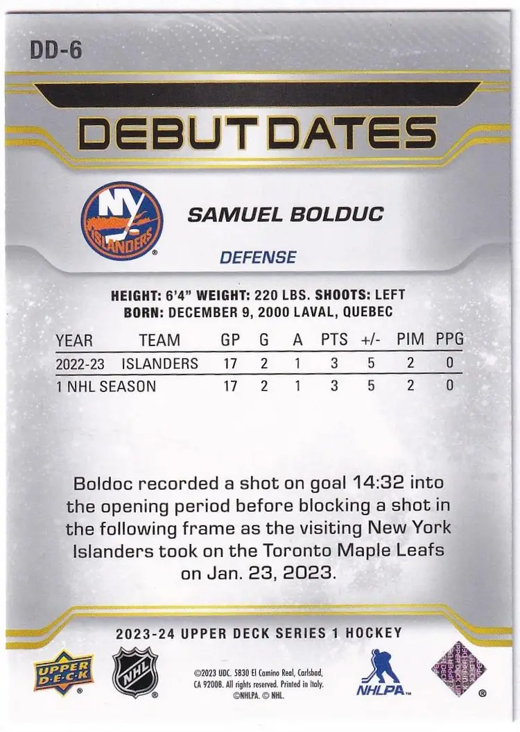 2023-24 Upper Deck Debut Dates #DD6 Samuel Bolduc New York Islanders