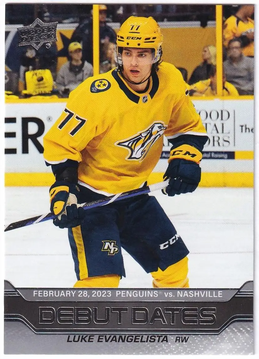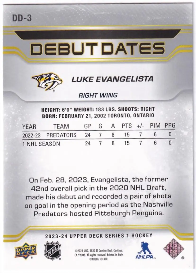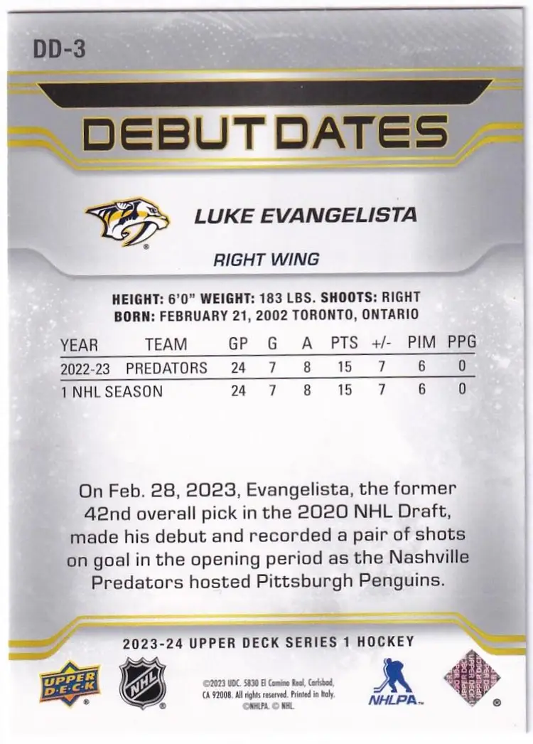 2023-24 Upper Deck Debut Dates #DD3 Luke Evangelista Nashville Predators