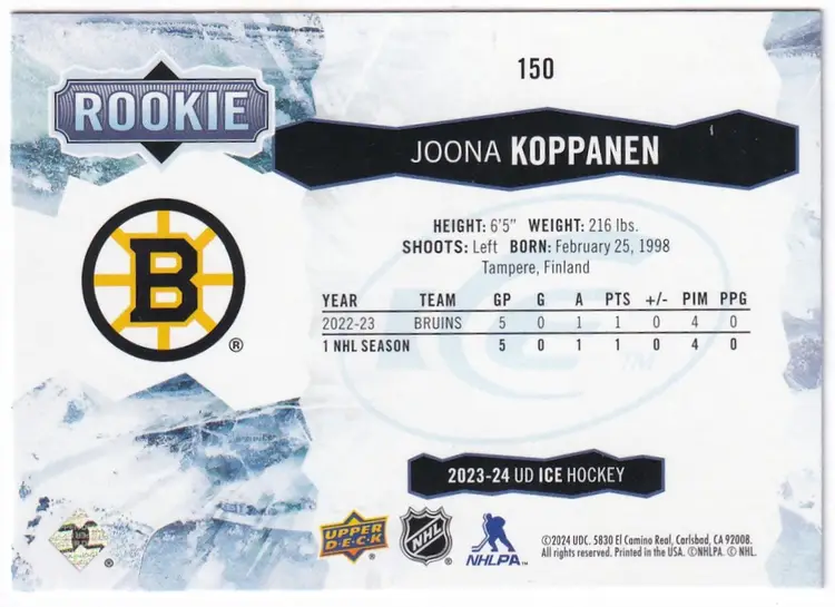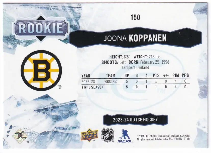 2023-24 Upper Deck Ice #150 Joona Koppanen RC Boston Bruins