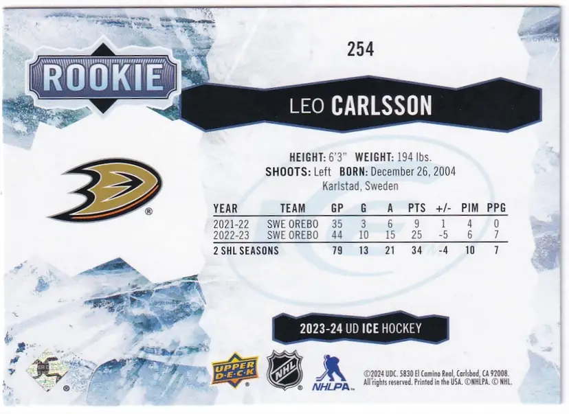 2023-24 Upper Deck Ice #254 Leo Carlsson EXT Anaheim Ducks