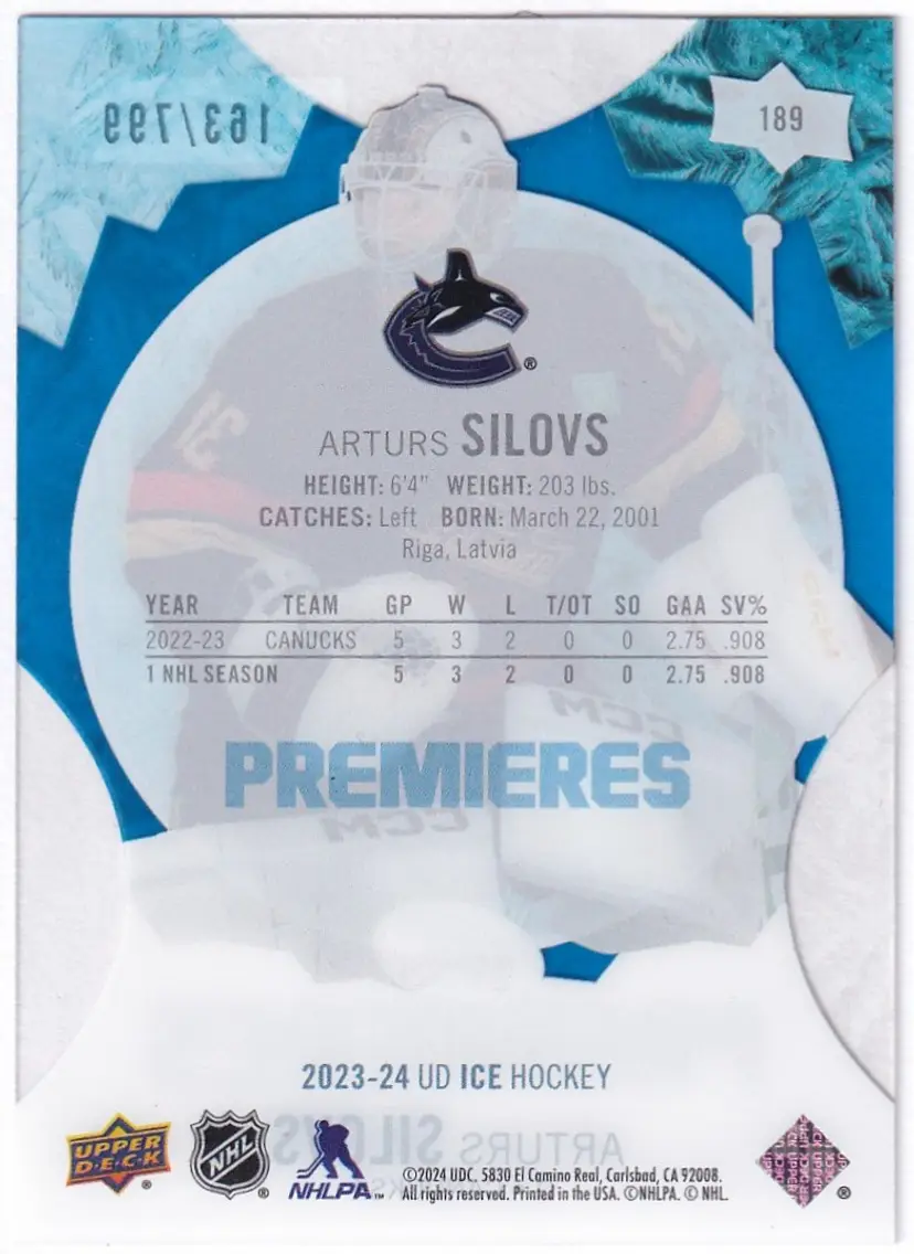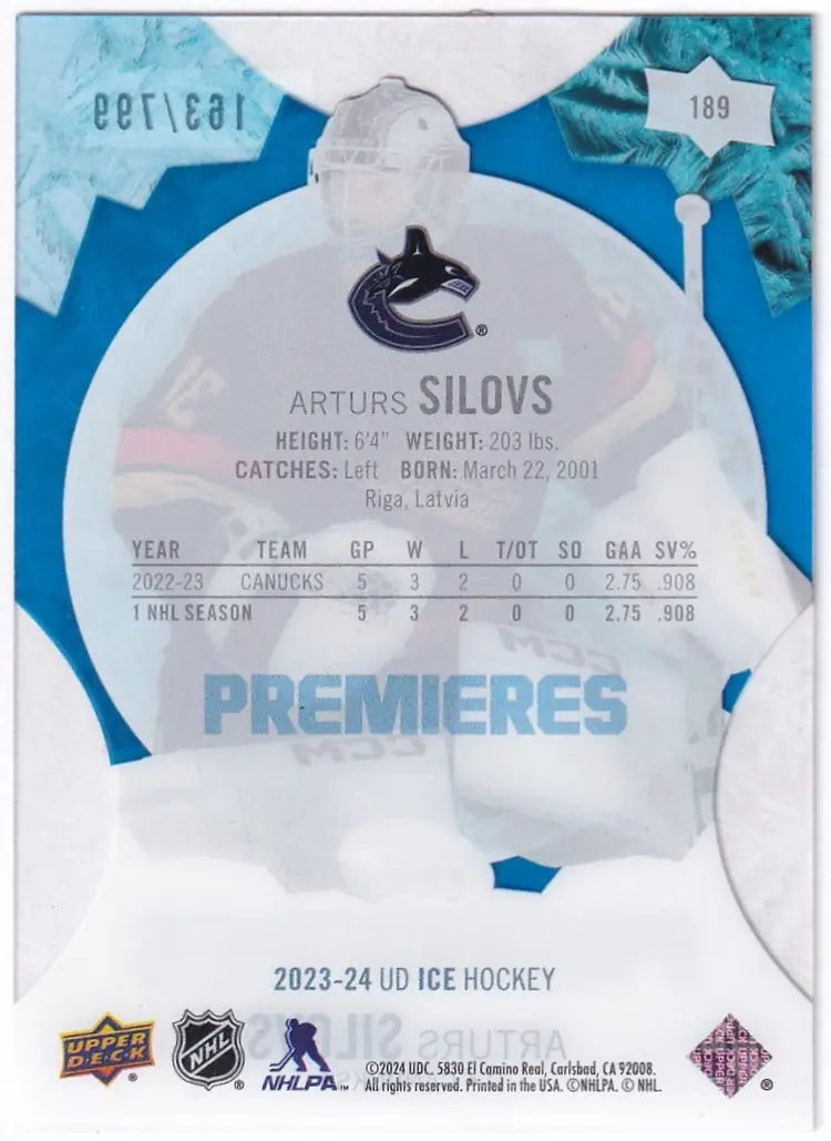 2023-24 Upper Deck Ice Premieres #189 Arturs Silovs Vancouver Canucks Print Run - 799