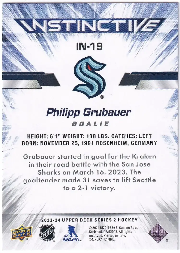 2023-24 Upper Deck Instinctive #IN19 Philipp Grubauer Seattle Kraken