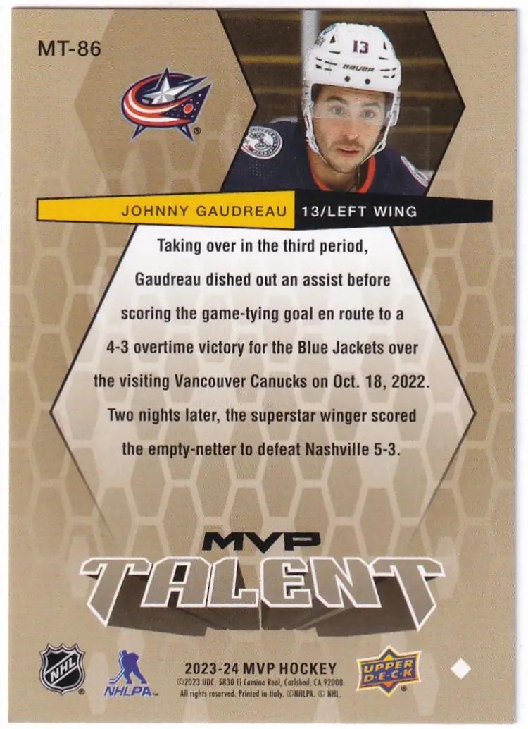2023-24 Upper Deck MVP Talent #MT86 Johnny Gaudreau Columbus Blue Jackets
