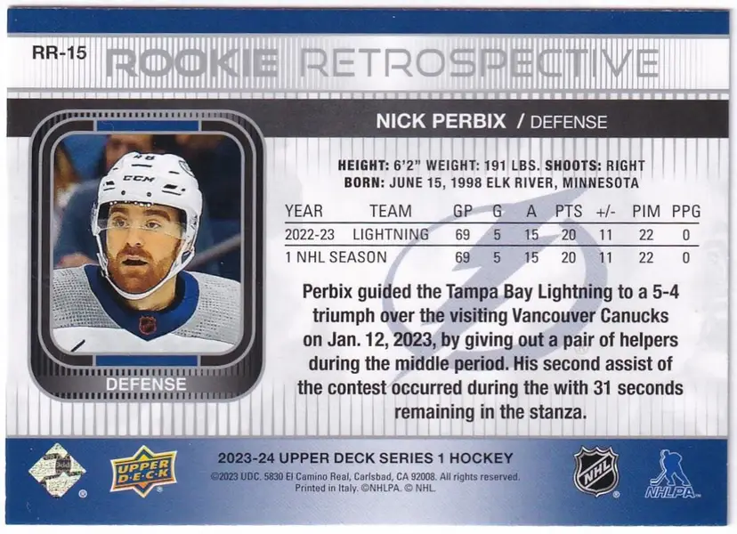 2023-24 Upper Deck Rookie Retrospective #RR15 Nick Perbix Tampa Bay Lightning