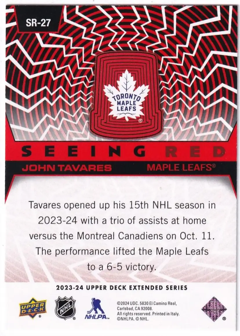 2023-24 Upper Deck Seeing Red #SR27 John Tavares Toronto Maple Leafs