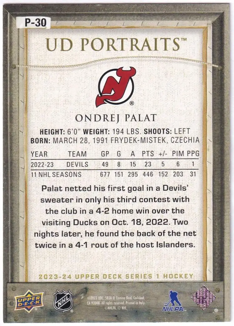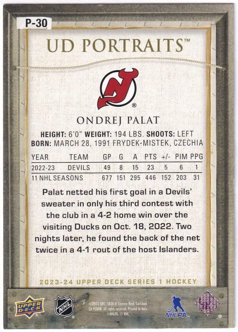 2023-24 Upper Deck UD Portraits #P30 Ondrej Palat New Jersey Devils