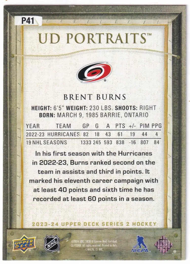 2023-24 Upper Deck UD Portraits #P41 Brent Burns Carolina Hurricanes