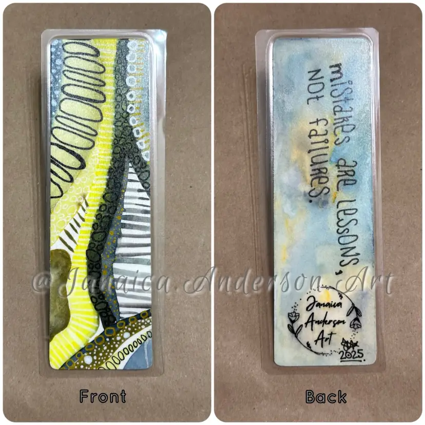 • Abstract bookmark hand painted on both sides. • Original acrylic, or watercolor & mixed media artwork. • Sealed and protected with (2) layers of archival varnish then laminated for long-term enjoyment! • Size is 2.25” wide by 6.25” tall.