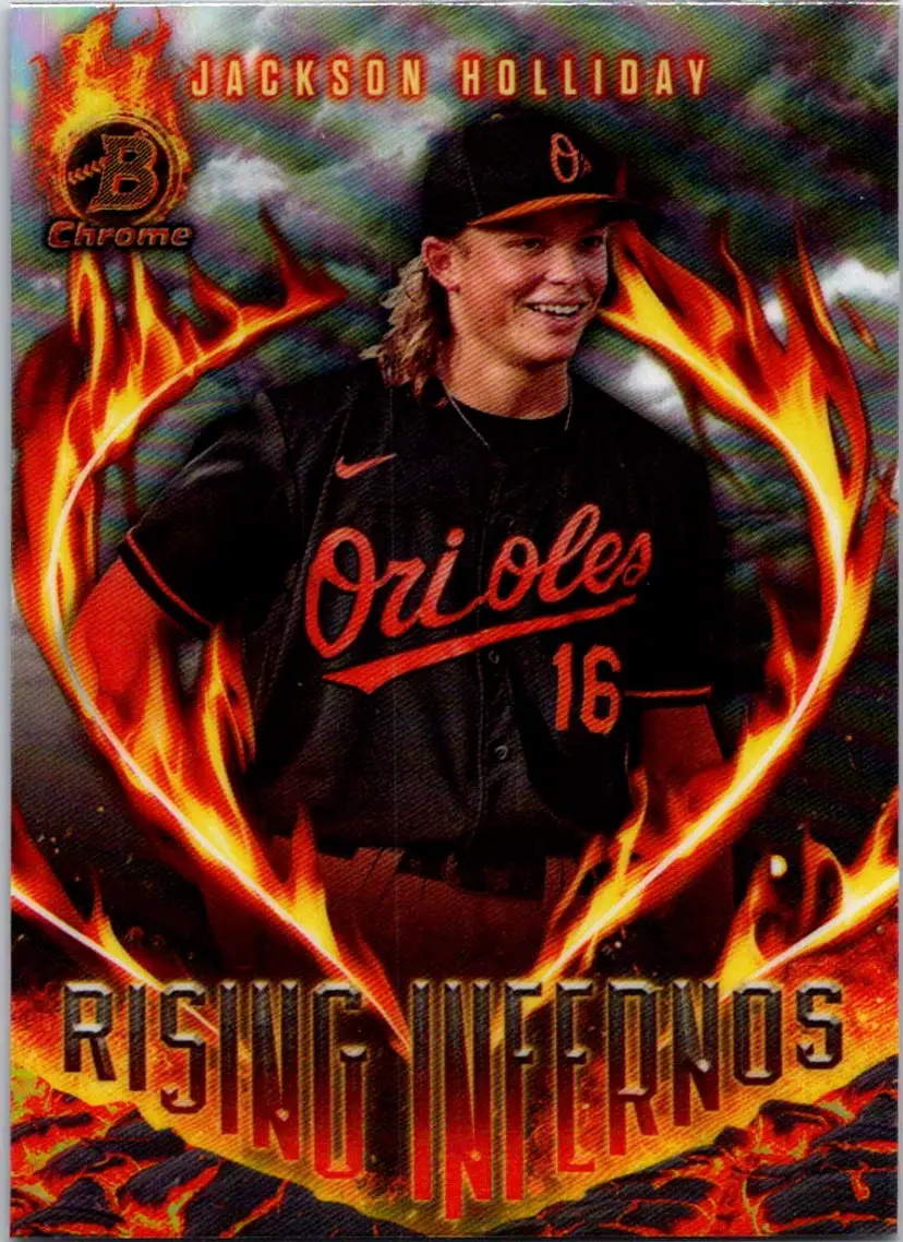 2023 Jackson Holliday Rising Infernos card from Bowman Chrome. A fiery addition for any baseball card collection! CARDS ARE SCANNED, NO LINES OR DAMAGE UNLESS NOTED (ON PENNY SLEEVE ONLY). ๐ฐ $1 combined shipping per additional item! โ Your card will arrive quickly and safely. Check our feedback!