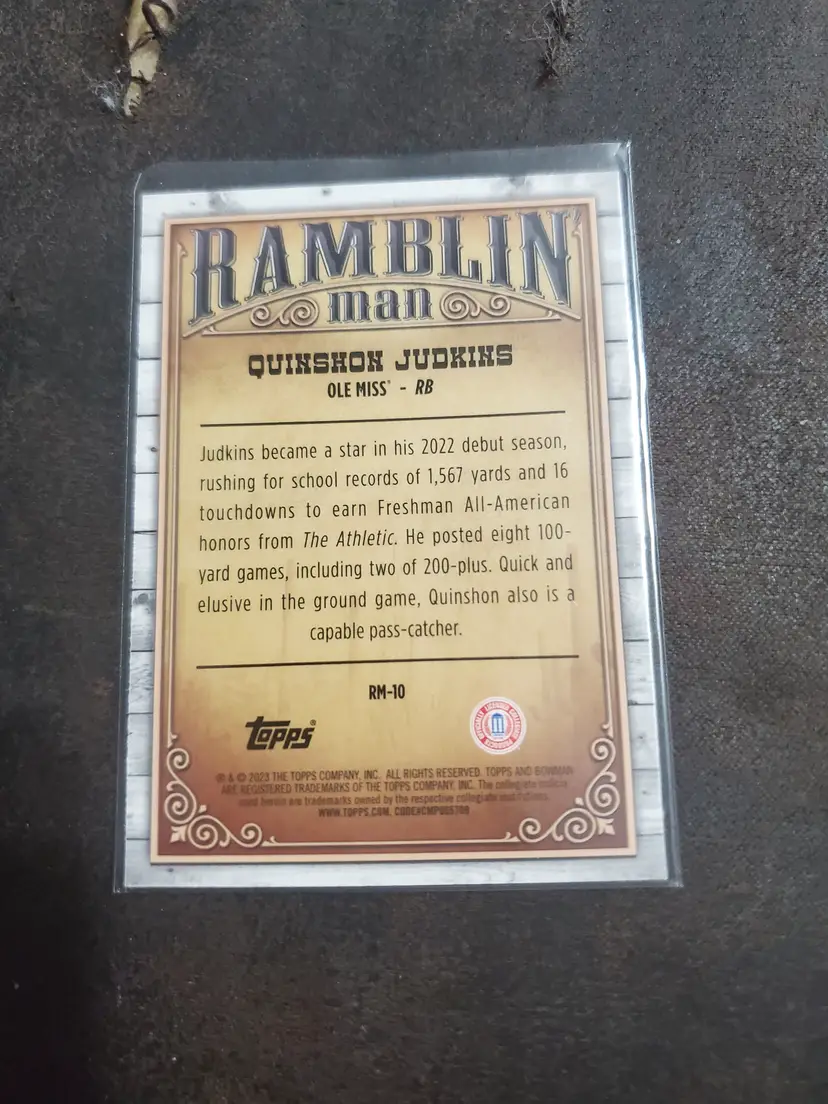 Check out this Bowman Chrome Ramblin' Man card featuring Quinshon Judkins in his Ole Miss gear. A must-have for college football card collectors!