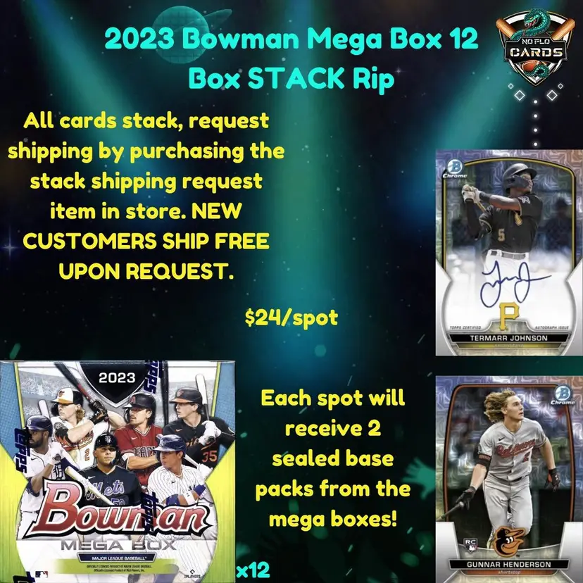 All cards stack, request shipping by purchasing the stack shipping request item in store. NEW CUSTOMERS SHIP FREE UPON REQUEST.Each spot will receive 2 sealed base packs from the mega boxes!