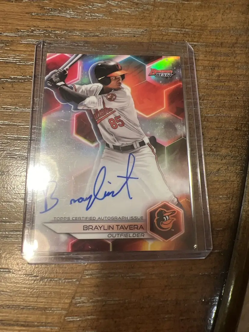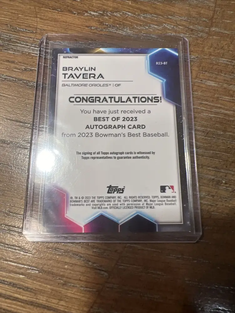 Card Size: Standard League: Major League (MLB) Autographed: Yes Set: 2023 Bowman's Best Autograph Format: Hard Signed Signed By: Braylin Tavera Year Manufactured: 2023 Player/Athlete: Braylin Tavera Insert Set: Best of 2023 Autograph Original/Licensed Reprint: Original Vintage: No Event/Tournament: MLB World Series Sport: Baseball Type: Sports Trading Card Parallel/Variety: Refractor Autograph Authentication: Topps Manufacturer: Bowman Team: Baltimore Orioles Features: Autograph, Parallel, Refractor Card Number: B23-BT Season: 2023 Country/Region of Manufacture: United States