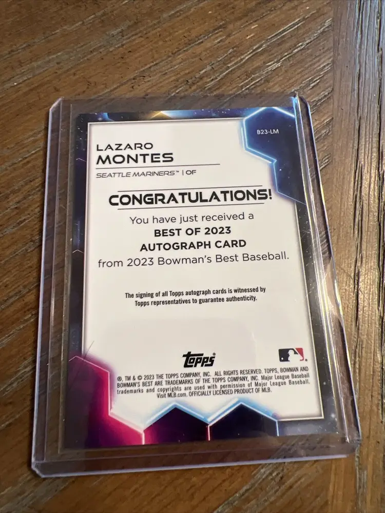 Autographed: Yes League: Major League (MLB) Set: 2023 Bowman's Best Autograph Format: Hard Signed Product: Single Player/Athlete: Lazaro Montes Year Manufactured: 2023 Type: Sports Trading Card Sport: Baseball Parallel/Variety: Chrome Manufacturer: Topps Features: Rookie Team: Seattle Mariners Card Number: B23-LM Season: 2023