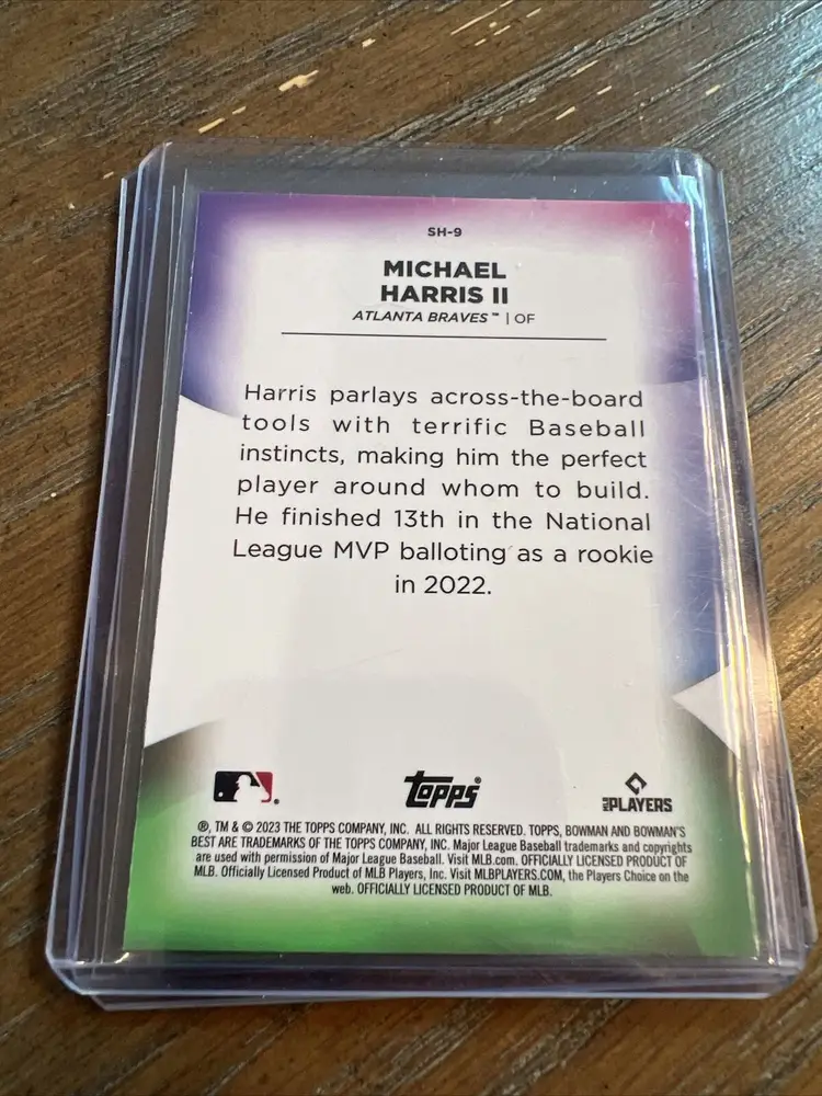 Card Size: Standard Type: Sports Trading Card Autographed: No Parallel/Variety: Refractor Material: Card Stock Sport: Baseball Set: 2023 Bowman's Best Team: Atlanta Braves Player/Athlete: Michael Harris II Insert Set: Shellacked Features: Rookie, Insert Season: 2023 League: Major League Baseball (MLB) Manufacturer: Topps Card Number: SH-9