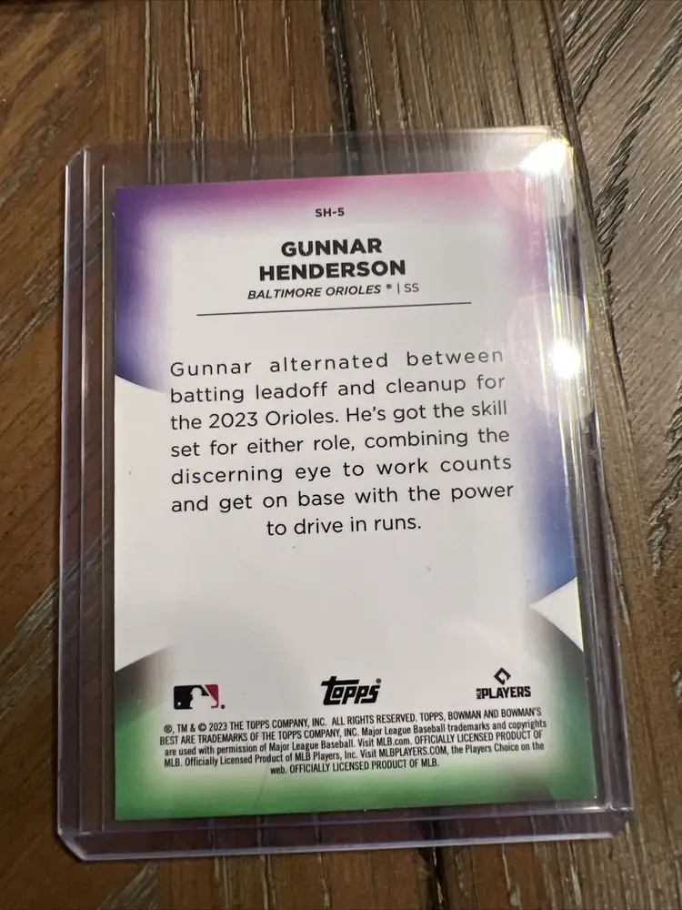 League: Major League (MLB) Autographed: No Set: 2023 Bowman's Best Player/Athlete: Gunnar Henderson Year Manufactured: 2023 Type: Sports Trading Card Sport: Baseball Parallel/Variety: Refractor Manufacturer: Bowman Features: Insert, Rookie, Shellacked Team: Baltimore Orioles Card Number: SH-5 Season: 2023