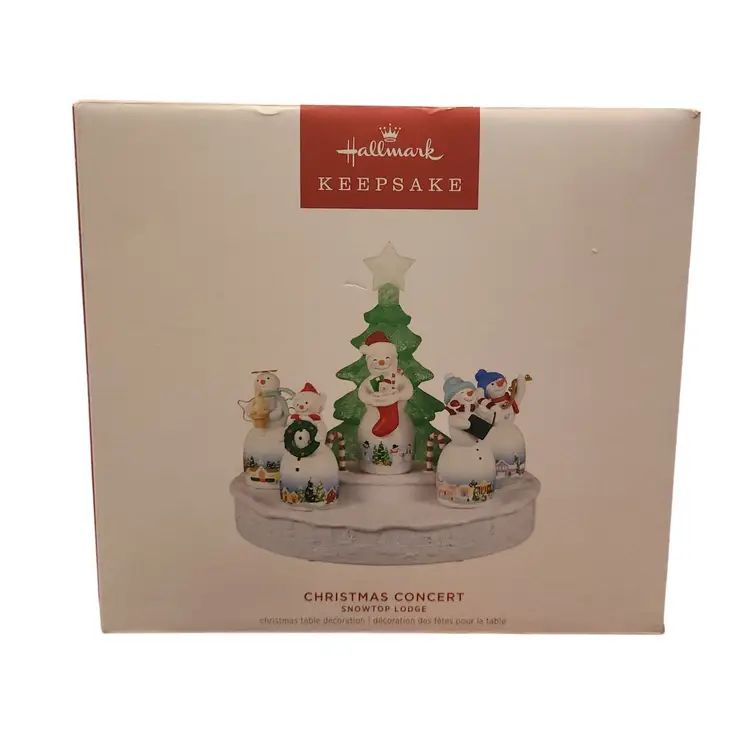 Create a festive, musical winter wonderland in the cozy comfort of your holiday home. Inspired by the Snowtop Lodge Hallmark Keepsake Ornaments created by Hallmark Artist Joanne Wright, this adorable interactive tabletop decoration features five charming snowmen standing in the snow around a sparkling Christmas tree. Connect to the included power adapter to see a continuous light effect. Then place one of the snowmen on the raised platform to hear a holiday song and see a synchronized light show. Plays "We Wish You a Merry Christmas," "Jingle Bells," "Hark the Herald Angels Sing," "Here We Come A-Caroling" and "Jolly Old St. Nicholas." No batteries necessary. •Artist crafted by Joanne Wright. . •Size Approx.: 10.12 x 9.12 x 10.12 • Made by Hallmark Keepsake, a trusted name in holiday décor New in the original box. Original box may have minor wear due to storage.