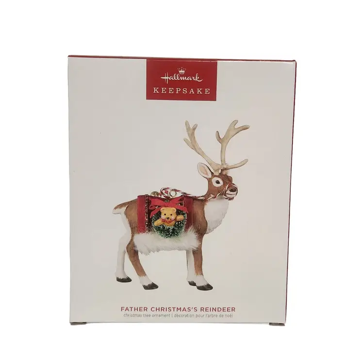 Celebrate the holiday season with the 2023 Hallmark Father Christmas Reindeer Keepsake Ornament. This limited edition ornament, crafted from mixed materials, captures the charm of Christmas tradition and is a must-have for collectors. Welcome the wonder of the season with this handsome Christmas tree ornament. The regal reindeer features a fabric saddle blanket trimmed with faux fur and adorned with a tiny teddy bear and bottlebrush wreath attachment on one side, and a sack filled with toys on the other. Coordinating 2023 Father Christmas ornament (sold separately). • Limited quantity, first available at the 2023 Keepsake Ornament Premiere event • Artist Joanne Wright. • Size Approx 4.5 x 5.5 x 2.75 • Perfect for collectors New in Original Box.