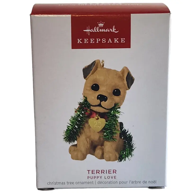 Share your love for cute and curious canine companions with this adorable Christmas tree ornament. This precocious terrier puppy dog holds a string of tinsel garland in its mouth, ready to help decorate for the holidays. A red bow around pup's neck features a "23" year-dated brass heart charm. • 33rd in the Puppy Love Keepsake Ornament series. • Designed by Anita Marra Rogers • Collectible ornament with brass tag detailing • Size Approx 1.29 x 2.07 x 1.57 New in the original box. Original box may have minor wear due to storage.
