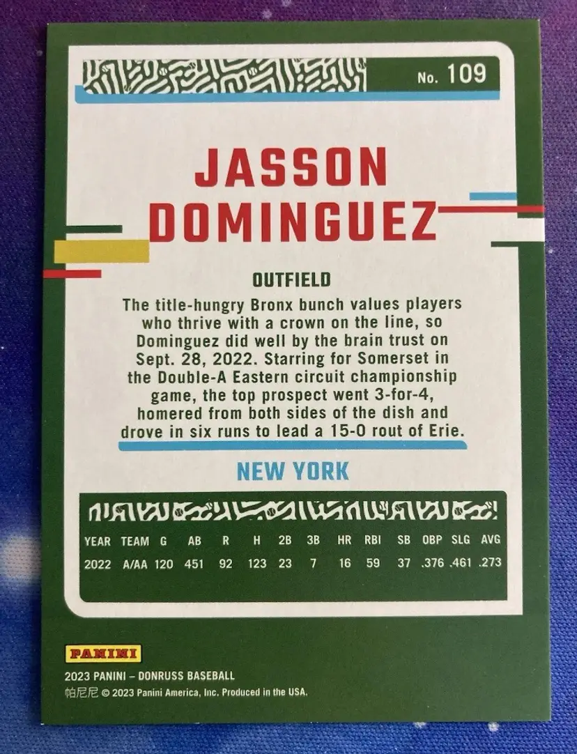 2023 Jasson Dominguez /123 Panini Donruss Season Stat Line #109 New York Yankees