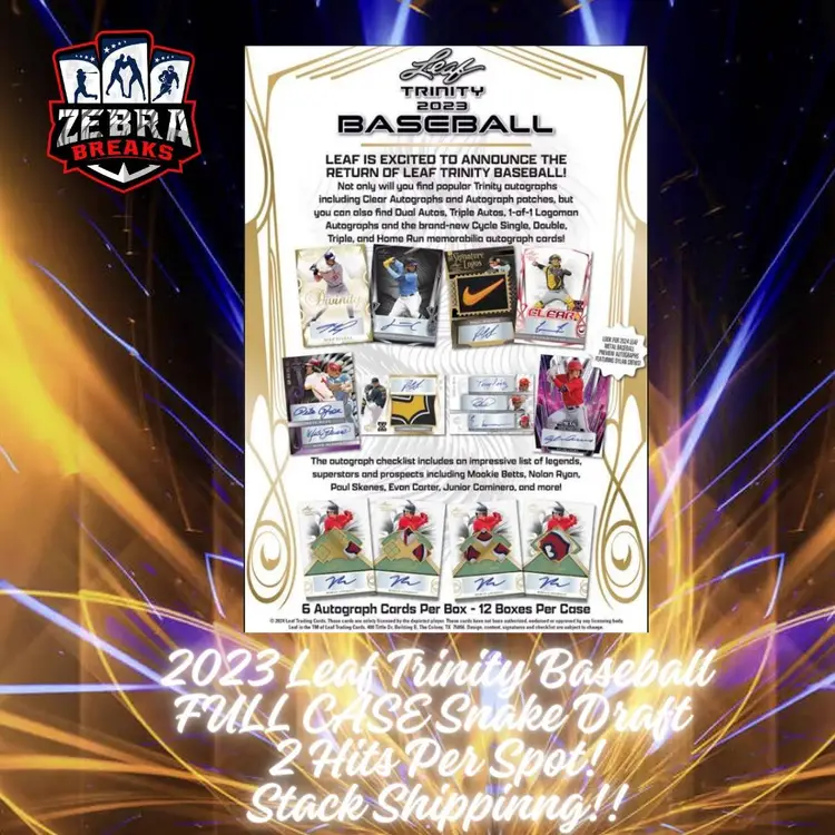 Full 12 Box Case of 2023 Leaf Trinity Baseball 12 Boxes Per Case/6 Hits Per Box - 72 Hits Each Spot will get 2 Hits! Order to be determined by Electronic Selection. That will be the order we select in. Once we get to the last spot, that spot will pick twice and reverse order back to the first spot in the order! STACK SHIPPING APPLIES