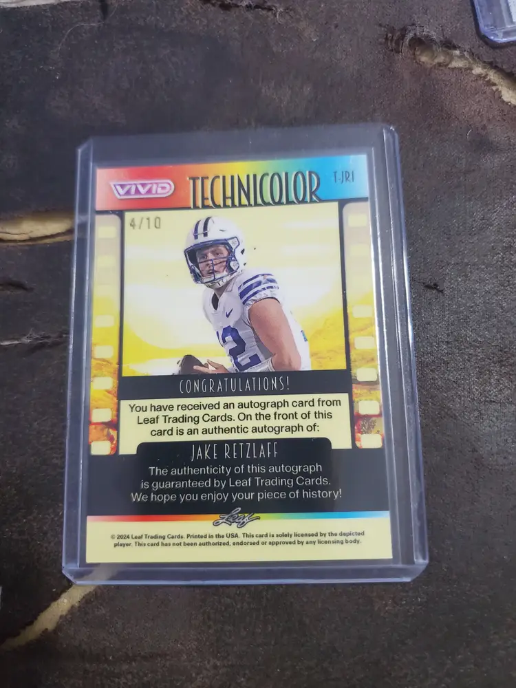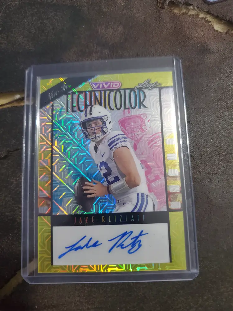 Check out this vibrant Leaf Vivid Technicolor card featuring Jake Retzlaff. Complete with an autograph, it's a standout piece for any football card collection!