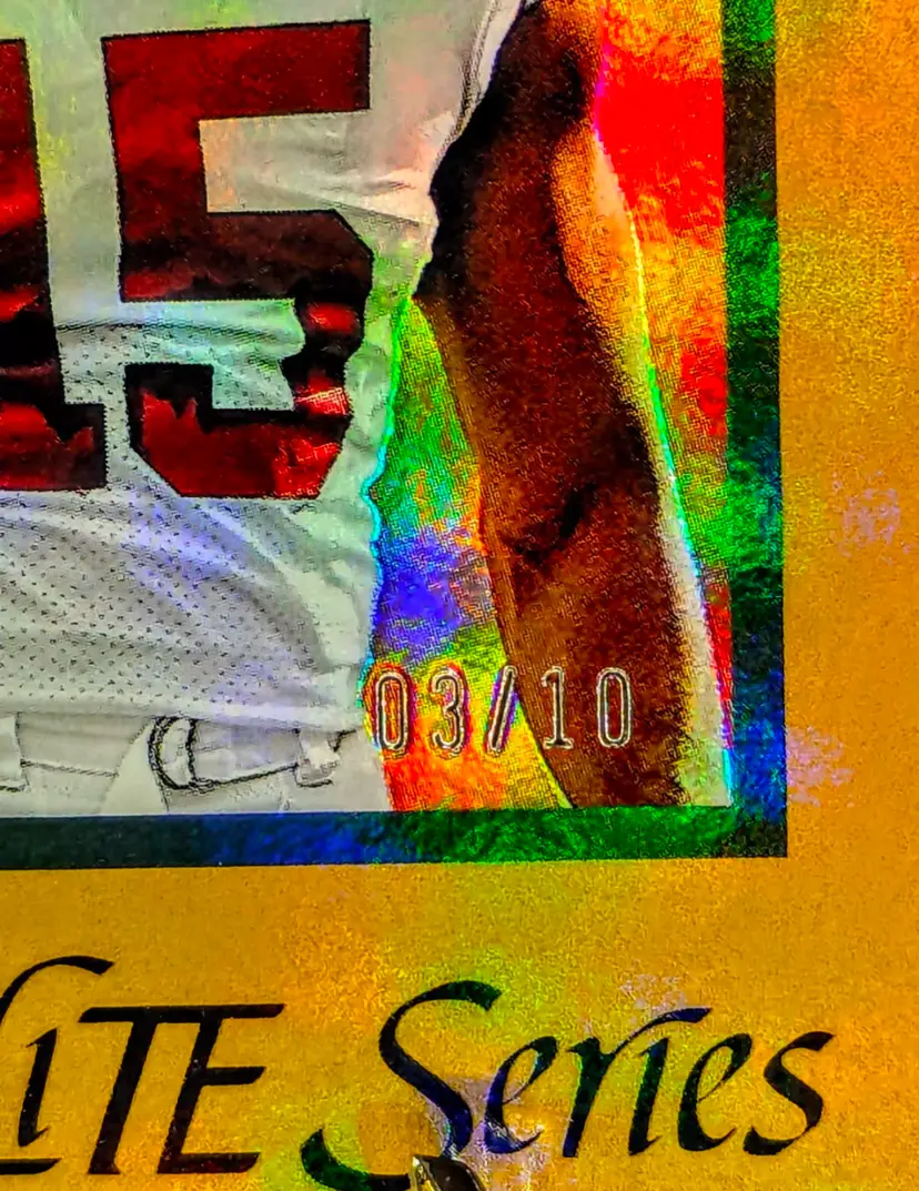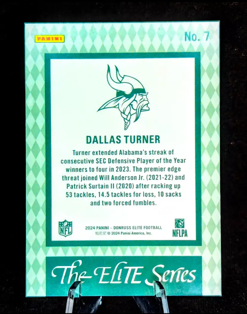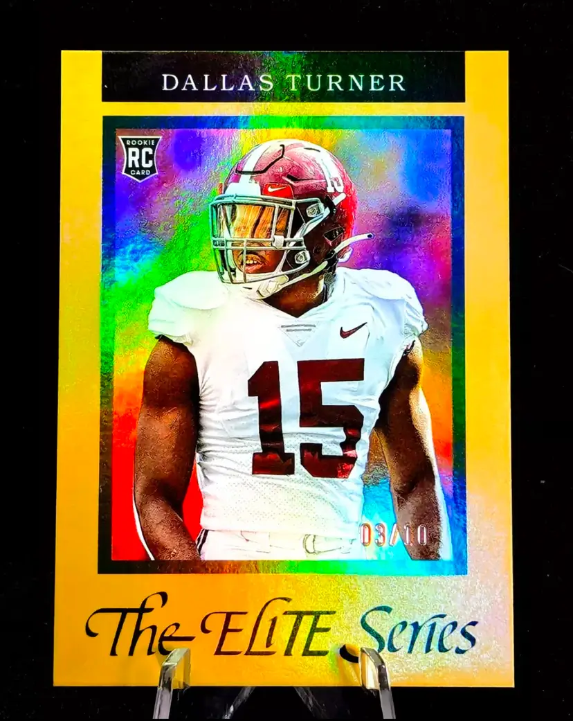 Snag this 2023 Panini Donruss Elite The Elite Series Gold Prizm Rookie Card of Dallas Turner, numbered 03/10. A standout piece for any football card enthusiast or Minnesota Vikings fan. Skol