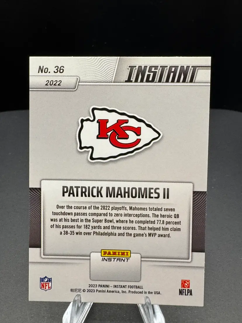 Card #36 from the 2023 Panini Champions set showcases Mahomes in action, commemorating his standout performance and leadership on football’s biggest stage. A must-have for Chiefs fans and collectors alike.