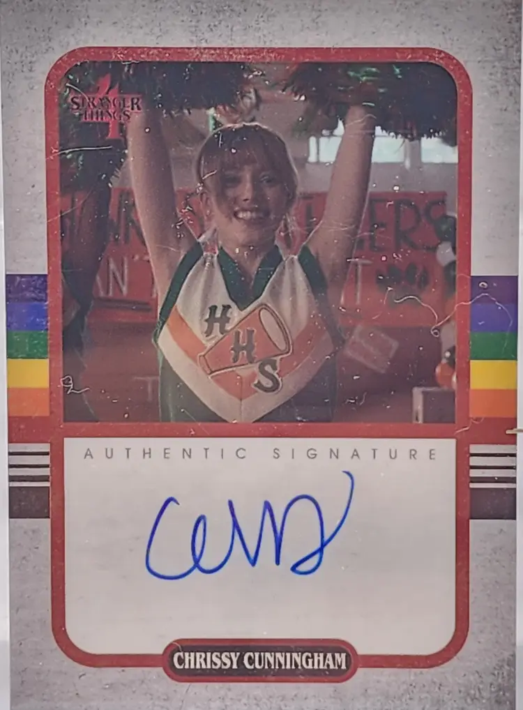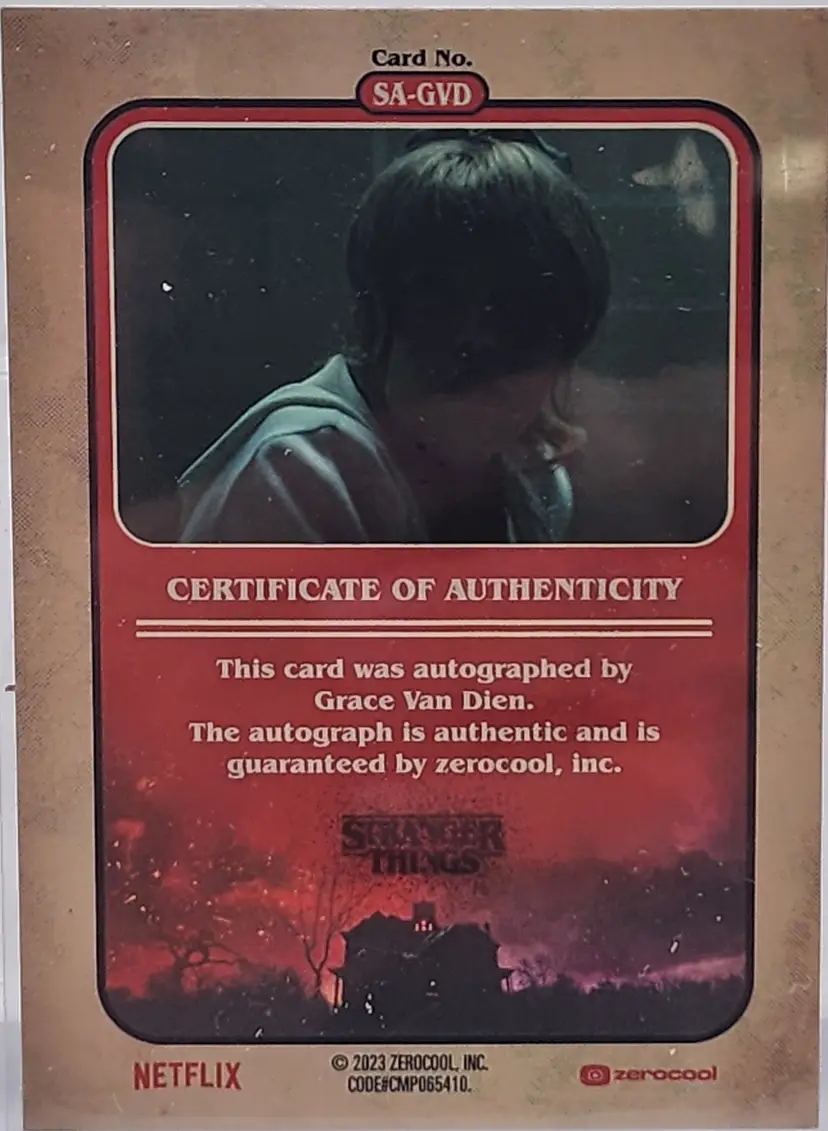 The product is a 2023 Stranger Things 4 Zerocool SA-GVD Grace Van Dien autographed trading card featuring the character Chrissy Cunningham. This non-sport trading card is a short print insert manufactured by Topps. It is signed by Grace Van Dien, who is the featured artist from the popular TV show Stranger Things. This collectible item is a rare chase card that would be coveted by fans of the series looking to add a unique piece to their collection.