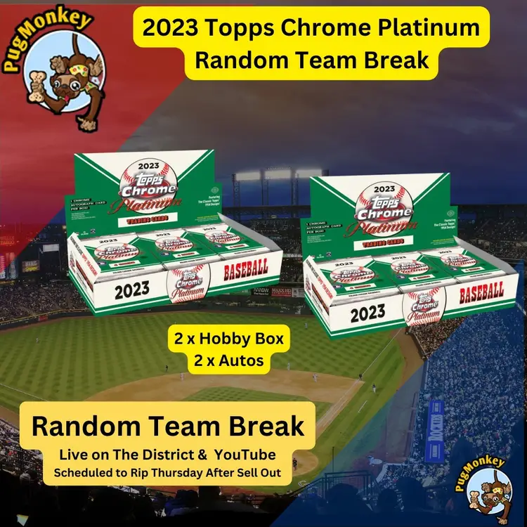 2 x 2023 Topps Chrome Platinum Hobby Boxes ⚾️ Rand0m Team Break ⚾️ Live on The District & YouTube ⚾️ Scheduled to Rip Thursday After Sell Out ⚾️ You will receive all cards pulled from the team(s) you are assigned live at start of break. ⚾️ BMWT Shipping is $5.00 for your first spot and $0.30/ea for any additional spot purchased.