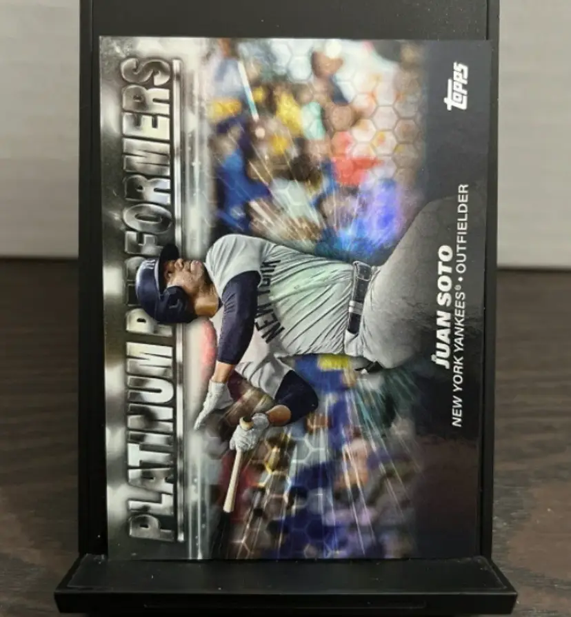 Check out this 2023 Topps Platinum Performers card featuring Juan Soto in his New York Yankees gear. A must-have for any baseball card collector!