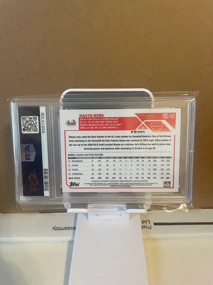Here I have a 2023 Topps Pro Debut Chrome MASYN WINN Orange Lava Refractor Auto /25 PSA 9. Slab will come well protected when delivered. Come get cardinals hottest prospect!!!