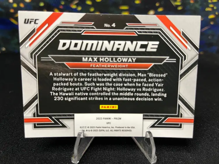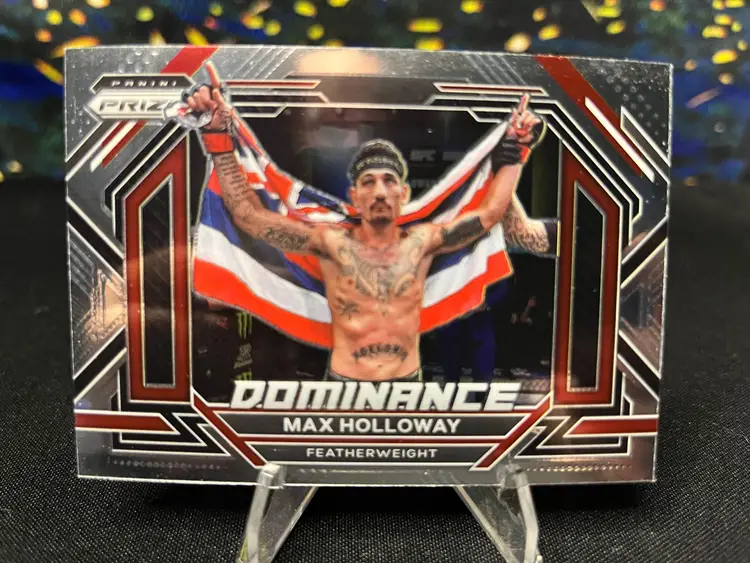 Rule the ring with this Max Holloway Prizm Dominance card, capturing the spirit of the Featherweight champ. A must-have for UFC collectors and Holloway supporters!