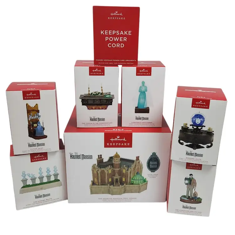 Relive the fun of a visit to the Disney Parks right on your Christmas tree with The Haunted Mansion tree topper that features music and dialogue from the beloved attraction. Plug it into the included power adapter for constant illumination, then press the button on the included remote control to start a synchronized sound and light show. Connect all of the Haunted Mansion Collection ornaments—Madame Leota, Victor Geist, The Coffin in the Conservatory, Constance Hatchaway, The Caretaker and His Dog, and The Singing Busts—and the Haunted Mansion Tree Topper with the Hallmark's Keepsake Power Cord to unlock additional amazingly interactive performances. We think you'll agree these happy haunts deserve a place in the dead center of your holiday decor. The coffin displays the iconic skeletal specter in his grandiose coffin, which glows from within. Constance Hatchaway resides in the attic where the ghostly “Black Widow Bride” recites the ominous vows shared with five dearly departed grooms. Known for her otherworldly incantations and disembodied head in a crystal ball, Madame Leota is seen summoning spirits from regions beyond. The resident organist of The Haunted Mansion's Grand Hall, Victor Geist plays "Grim Grinning Ghosts" as a solemn waltz for apparition attendees at a dinner party. With his canine companion at his side, the caretaker appears frozen with fright as he observes the ghostly goings-on of the Haunted Mansion. No journey through The Haunted Mansion’s ghoulish graveyard is complete without a serenade from The Singing Busts performing their signature song, “Grim Grinning Ghosts.” • Ornaments designed by Hallmark Keepsake Artist Orville Wilson, and Iman Zadrozny. • Includes Mansion Table Topper, 6 companion ornaments, and Keepsake Power cord. We have the 2020 Hitchhiking Ghosts in store for even more fun (SOLD SEPARETLY). New in the original boxes. Original boxes may have minor wear due to storage.