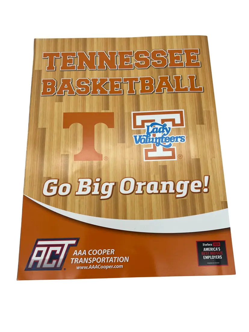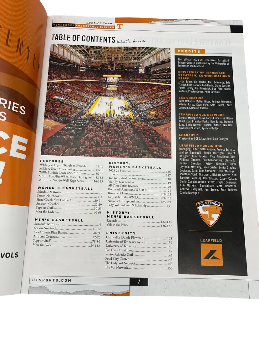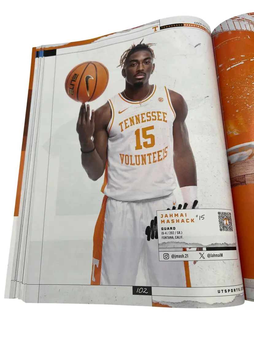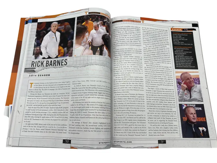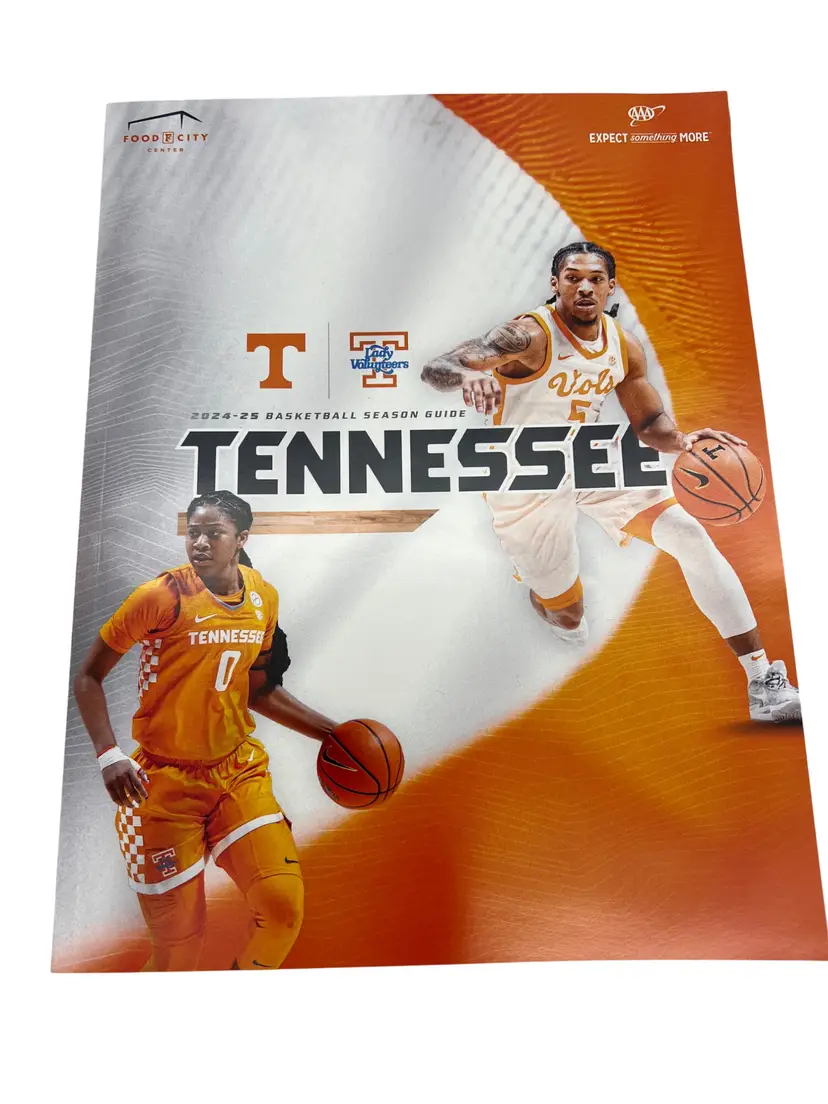 Official guide for the 2024/2025 Tennessee Volunteers and Lady Vols basketball teams. Includes team and individual pictures, feature stories, and all-time statistics. Measures 10.75" x 8.5" and has 150 numbered pages.