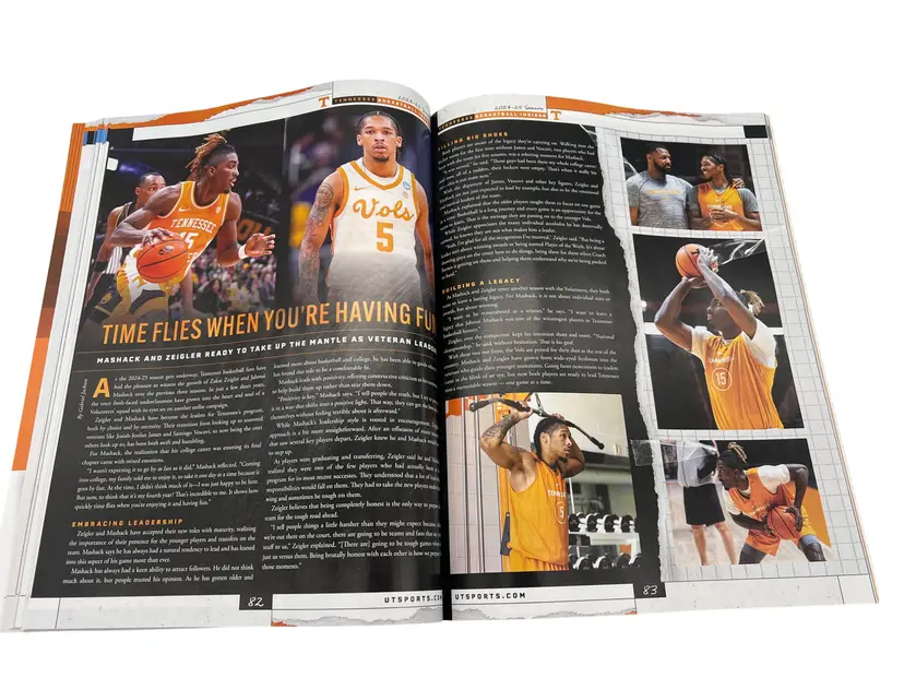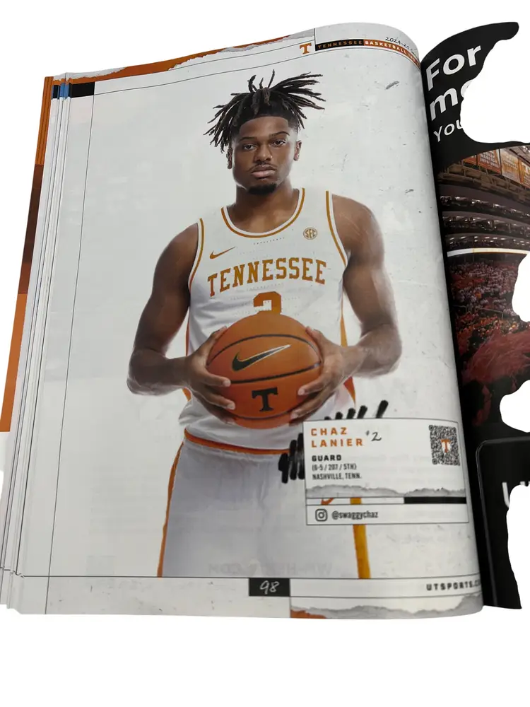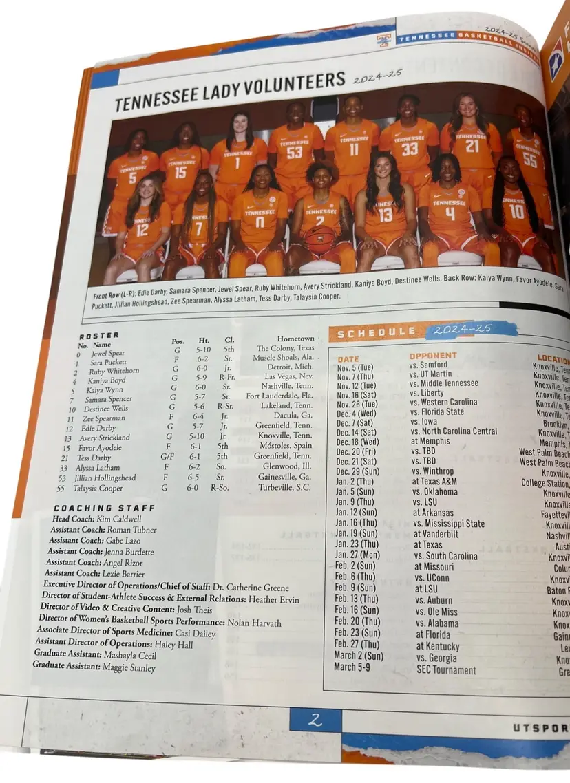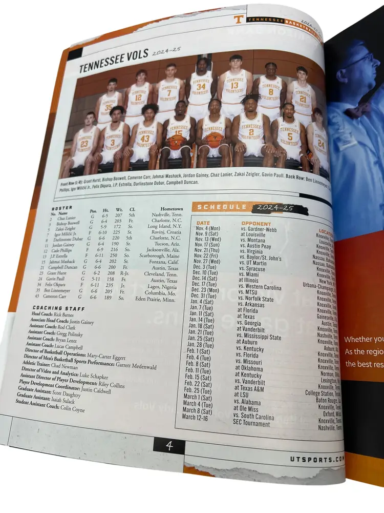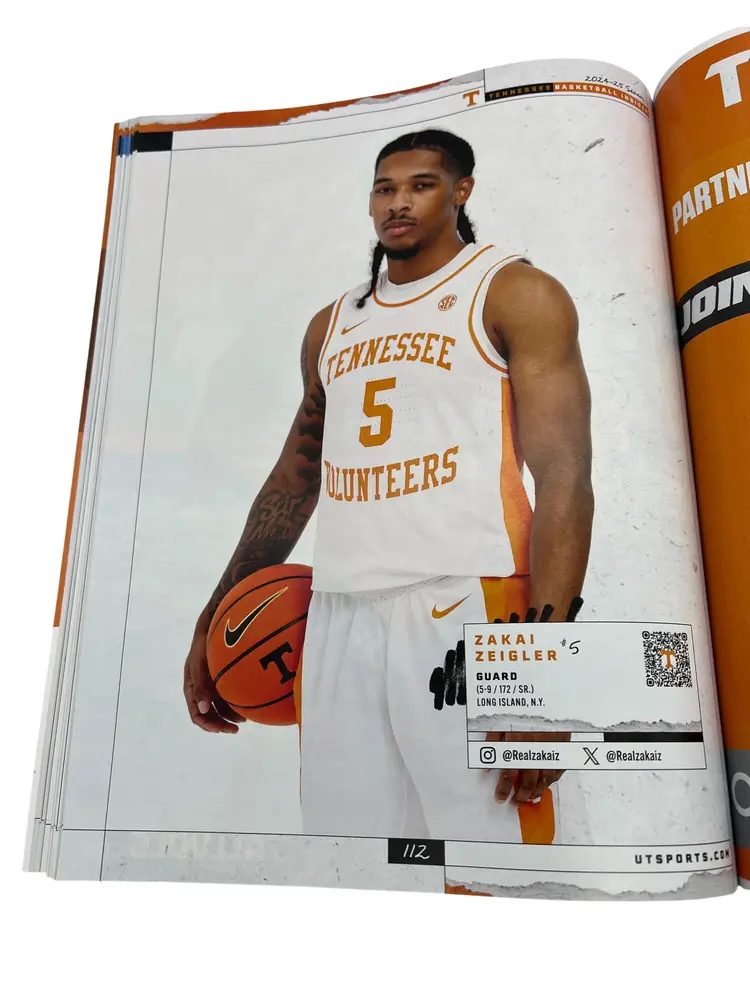 Official guide for the 2024/2025 Tennessee Volunteers and Lady Vols basketball teams. Includes team and individual pictures, feature stories, and all-time statistics. Measures 10.75" x 8.5" and has 150 numbered pages.