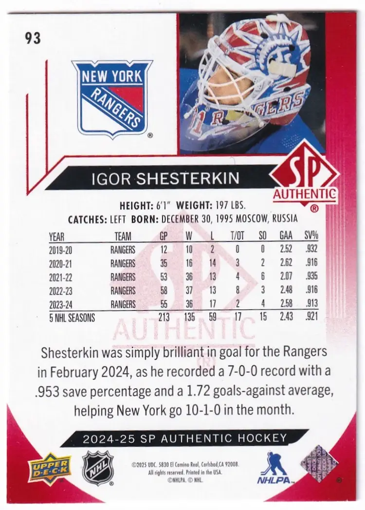 2024-25 SP Authentic Limited Red #93 Igor Shesterkin New York Rangers