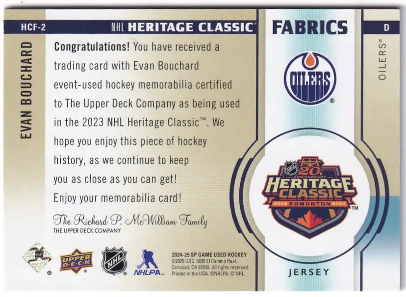 2024-25 SP Game Used '23 Heritage Classic Fabrics #HCF2 Evan Bouchard Edmonton Oilers