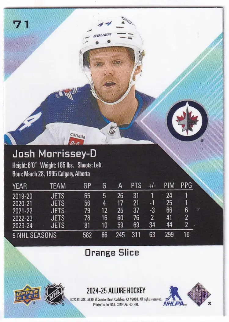 2024-25 Upper Deck Allure Orange Slice #71 Josh Morrissey Winnipeg Jets