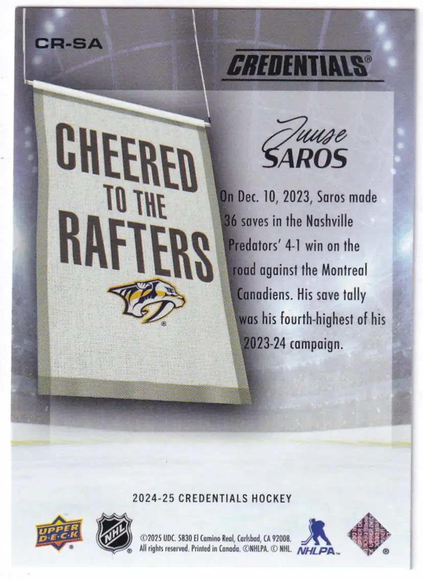 2024-25 Upper Deck Credentials Cheered to the Rafters #CRSA Juuse Saros Nashville Predators