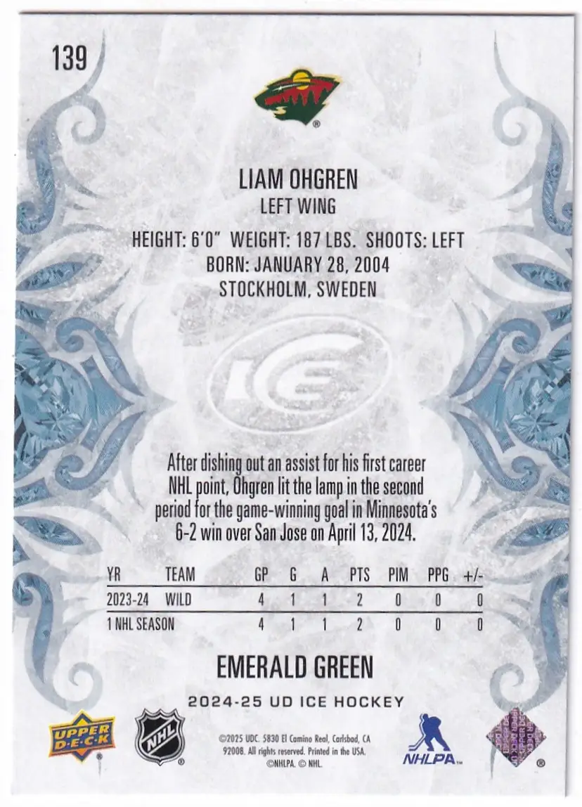 2024-25 Upper Deck Ice Emerald Green #139 Liam Ohgren Minnesota Wild