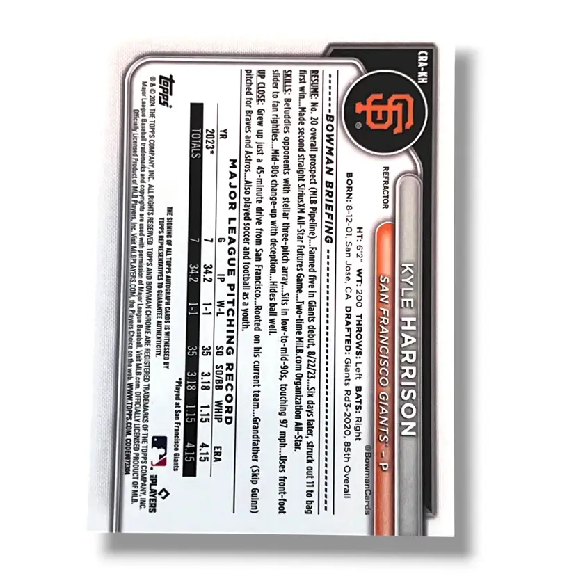 Here We Have a 2024 Bowman Chrome Kyle Harrison Rookie Autograph Refractor 374/499 #CRA-KH