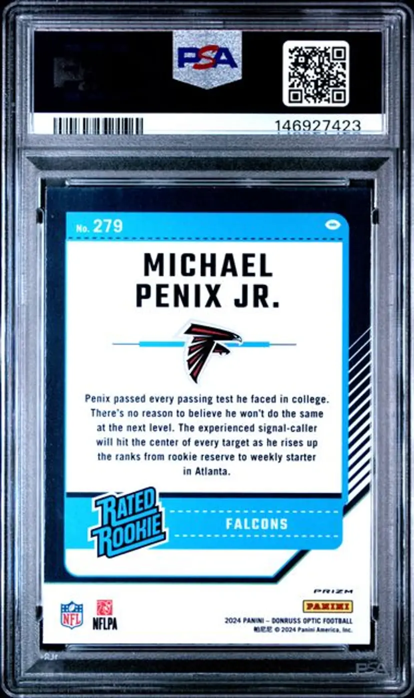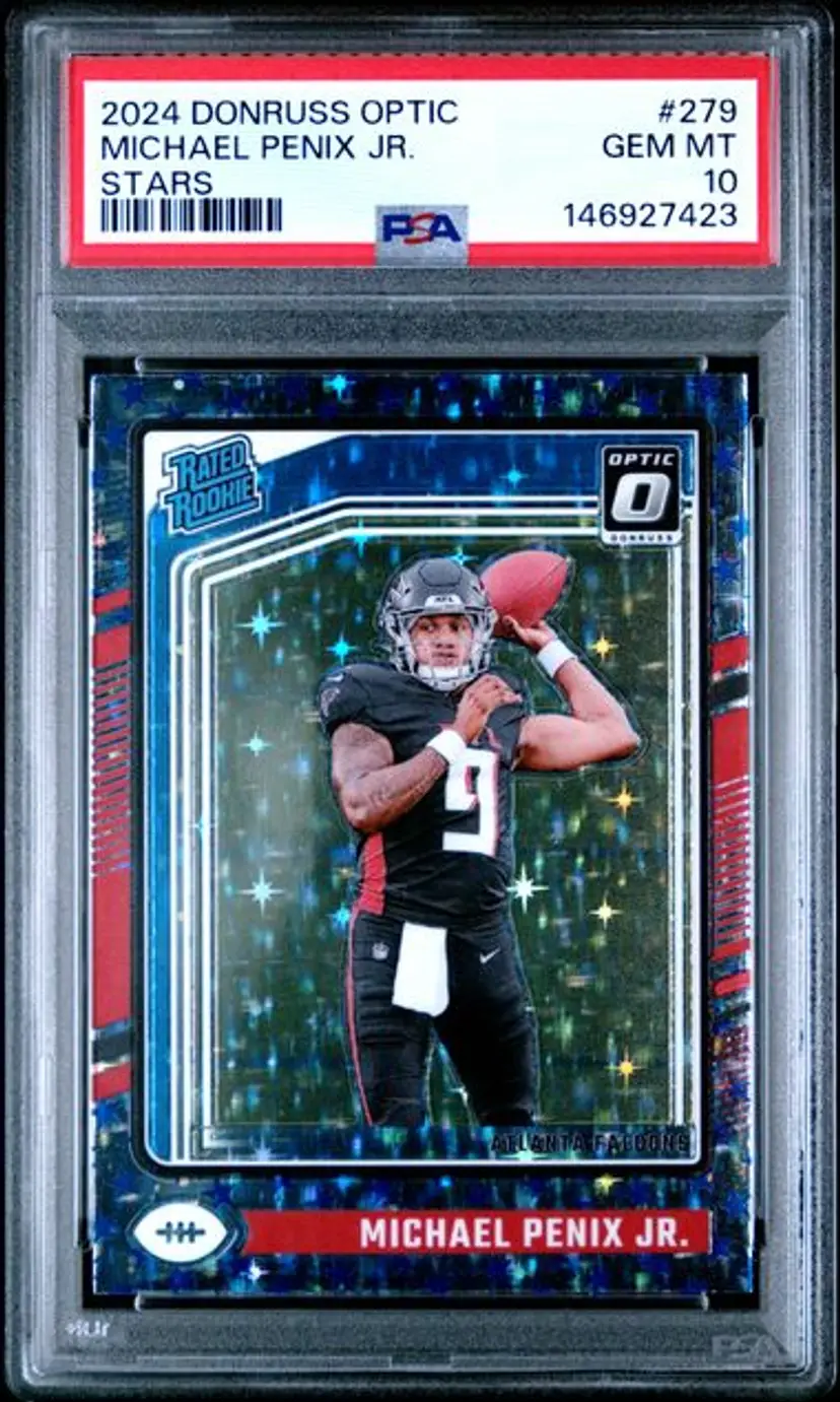 Gem Mint 10 graded rookie card of Michael Penix Jr. from the 2024 Donruss Optic series. A must-have for collectors!