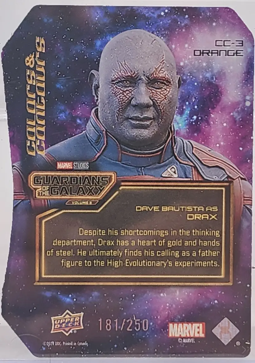 The product is a 2024 Guardians of the Galaxy Vol 3 trading card featuring Drax, a character portrayed by Dave Bautista in the Marvel Cinematic Universe. This particular card is a rare Orange parallel variety with a limited print run of 69 out of 250. Manufactured by Upper Deck, the card is serial numbered and serves as an insert in the set. It is a highly sought-after collectible for fans of Guardians of the Galaxy and Marvel enthusiasts alike.