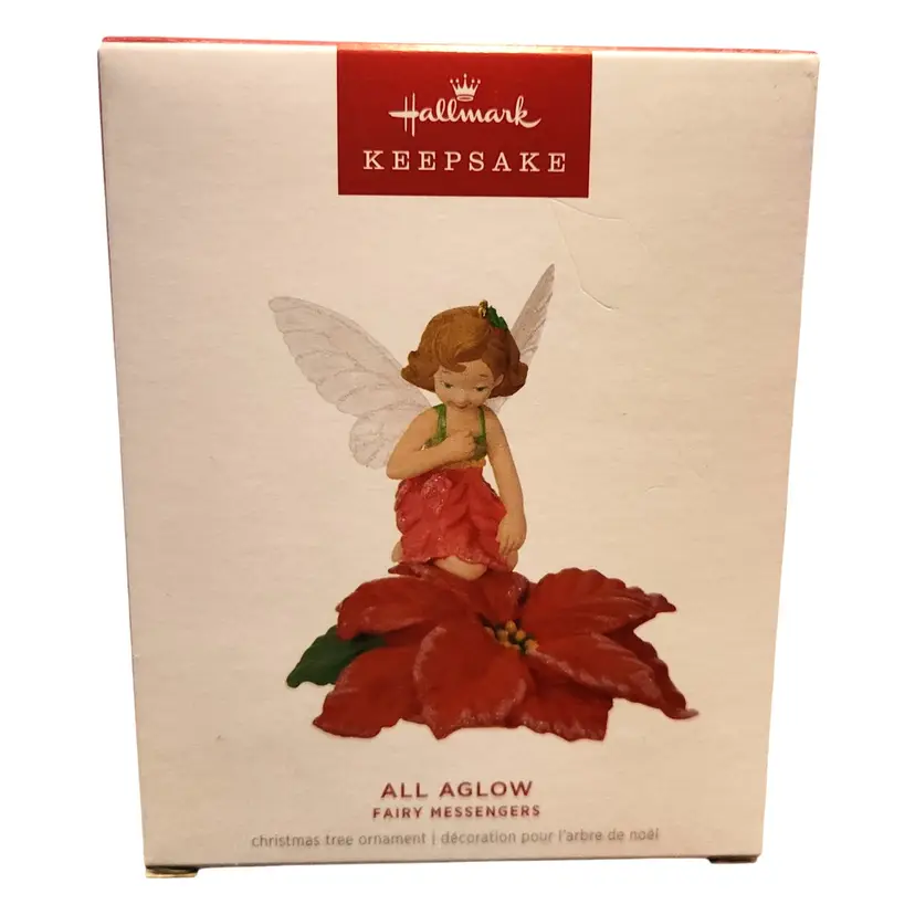 Brighten the holidays when you display this delightful complement to your Fairy Messengers collection. Wearing her pretty pink, petal-inspired skirt with a sprig of holly in her wavy brown hair, the festive Poinsettia Fairy—the first in the beloved Keepsake Ornament series—kneels on the edge of a brilliant red poinsettia blossom. Connect the decoration to Hallmark's Keepsake Power Cord (sold separately) to see a continuous light effect. • Includes Magic Light Feature • Requires Hallmark's Keepsake Power Cord (sold separately). • Designed by Kristina Gaughran, Hallmark Keepsake Artist • Approx. Size in Inches: 3.34 x 3.54 x 3.03 New in the original box. Original box may have minor wear due to storage.
