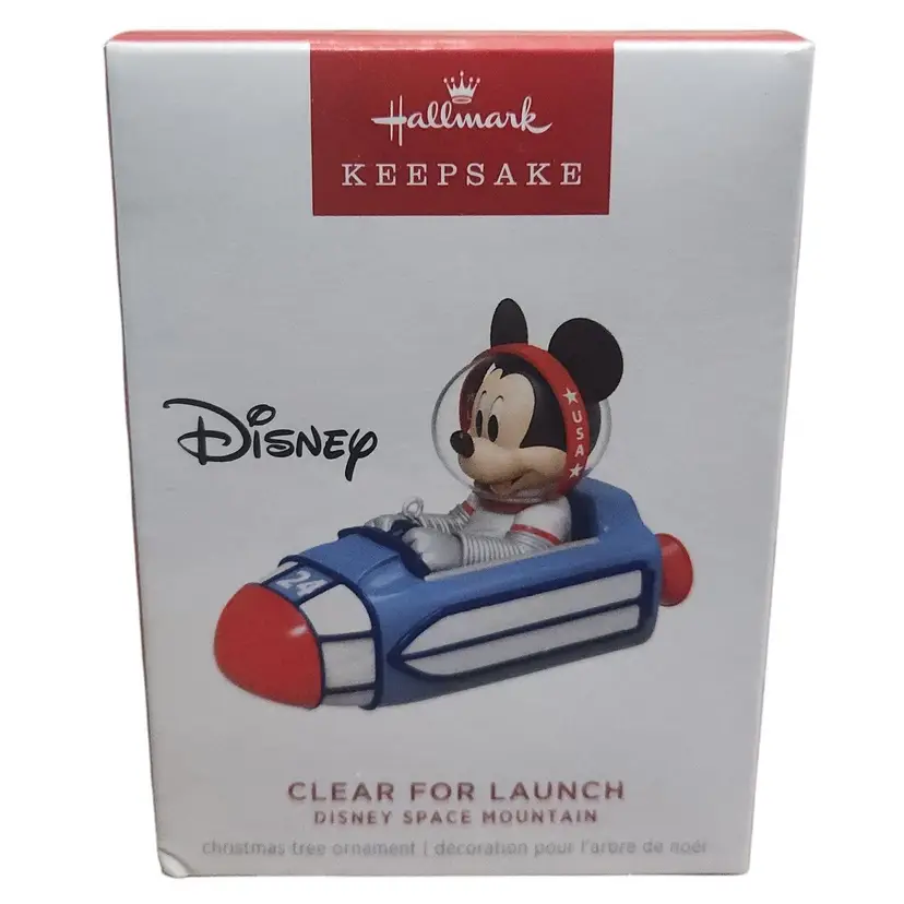 Imagine zooming through the galaxy with Disney Mickey Mouse this holiday season. Mickey launches his rocket ship bound for the furthest reaches of outer space in this Christmas tree ornament that's inspired by the beloved Space Mountain Disney Parks attraction. • Approx. Size in Inches: 1.5 x 2.48 x 3.49 • Hallmark Keepsake collection • Disney branded New in the original box. Original box may have minor wear due to storage.